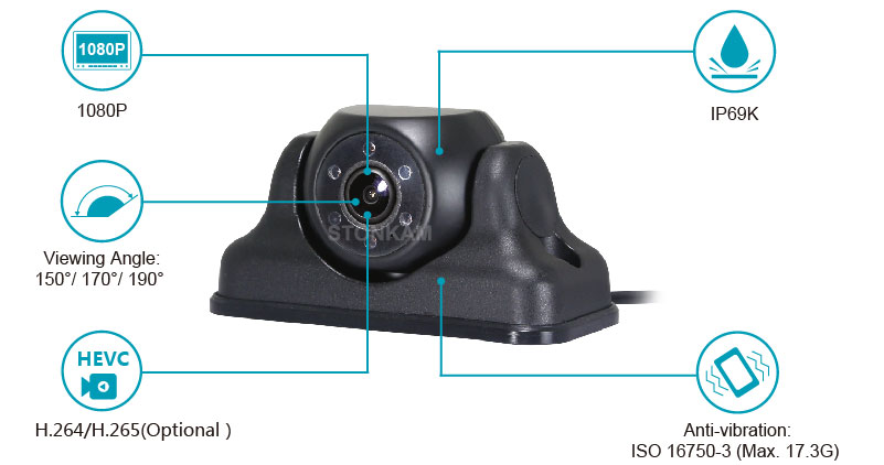 STONKAM 1080P High Definition IP Rear View Monitoring Camera features IP69K and super-wide angle(150°/170°/190°). This camera supports H.264/H.265 streaming technology which can save traffic and space, allowing you to enjoy a more reliable and convenient experience of high definition vehicle monitoring. Meanwhile, this camera has IP function. With the advanced digital transmission technology and image optimization module such as auto-controlling white balance, exposure, the camera view image is of high quality and excellent color demonstration. Click here for more STONKAM IP cameras.