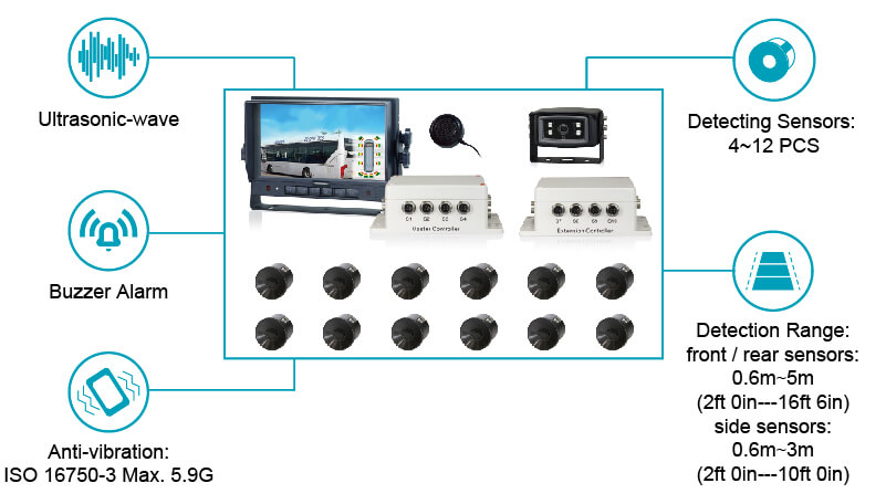 STONKAM® universal Ultrasonic Blind Spot Detection Kit supports 6/12 channels radar detection and 5 meters (16.4ft) detection distance. It achieves real-time display of the obstacle distance on the monitor. Click to see more radar detection systems.